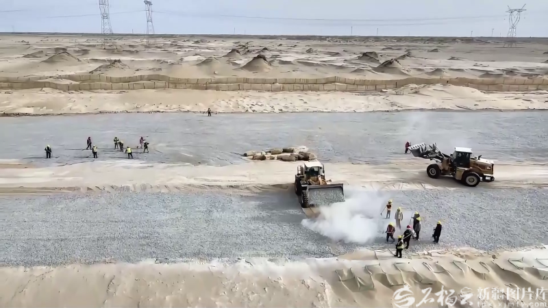 在“疆电外送”第四通说念电源名目新能源部分生态治沙工程现场,建立者们在风沙中奋战。巴音郭楞融媒体中心供图