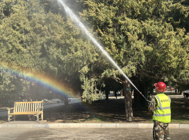 △北京地坛公园,园林绿化东说念主员用添加了花粉固定剂的水为圆柏“洗发”。