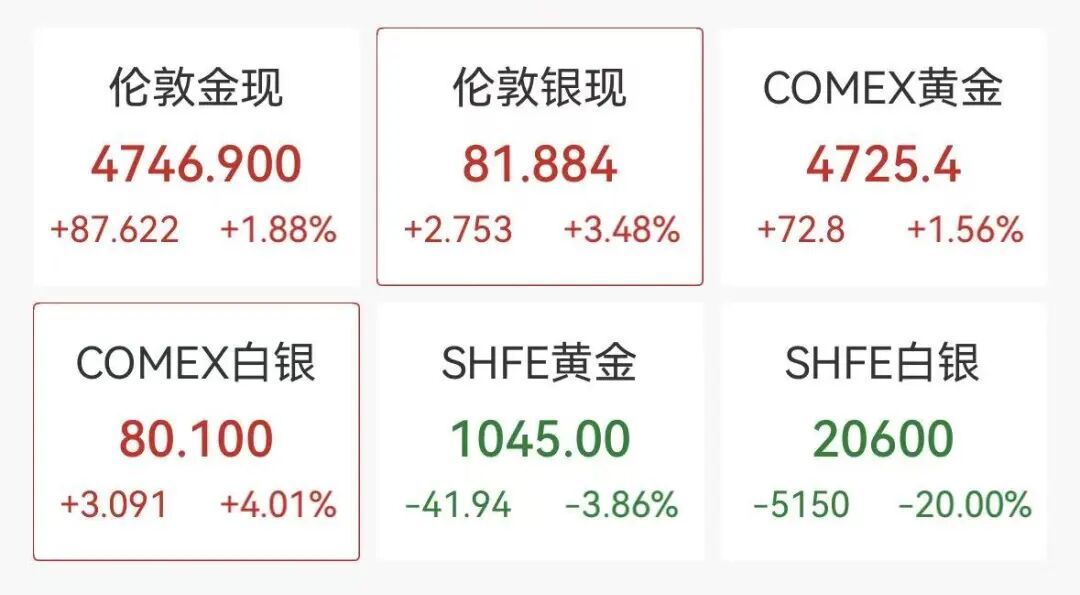 2月3日,现货黄金开盘涨近2%,重回4700好意思元,最新报4746.9好意思元/盎司,现货白银报81.8好意思元/盎司,高潮超3%。